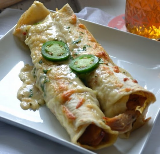 Cover tortillas with remaining sauce and then sprinkle with remaining cheese. Bake enchiladas for 25 minutes. Remove from oven, top with cilantro and jalapenos, and then let cool for five to ten minutes before serving.