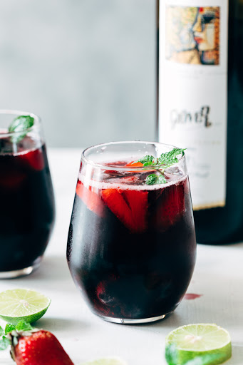 Add two parts wine to the glass and stir again. Top with carbonated soda, add a sprig of mint and enjoy!