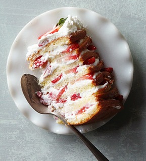 Line an 11-inch round straight-side Dutch oven or other 11-inch diameter container with plastic wrap, allowing wrap to hang over edges. Using a serrated knife, split cake in half horizontally. Place top half of cake, cut side up, in prepared container. Top with strawberries. Place cake bottom, cut side down on strawberries. Press down lightly.