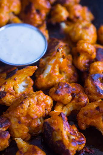 Once the cauliflower is done its first bake in the batter, remove them from the oven and put all the baked florets into a mixing bowl with the wing sauce and toss to coat evenly. Return cauliflower to the baking sheet and bake in the oven for another 10-15 minutes or until reached desired crispness. Serve with ranch, blue cheese, or your favorite dipping sauce. Enjoy!