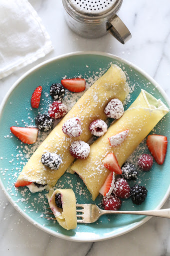 To serve, spoon 1 tablespoon cream or your desired filling into center of each crepe. Top with some berries and roll crepes.