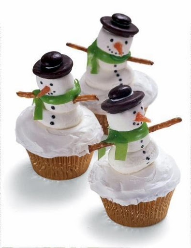 Easy and adorable snowmen cupcakes are fun to make. Start with your favorite cupcake recipe frosted with white icing, then make the snowmen out of marshmallows.