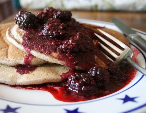 Mix dry ingredients. Add egg white, milk and vanilla. Mix well. Using 1/4 cup batter for each pancake, cook on a nonstick griddle or pan until bubbles begin to break on the surface. Flip and finish cooking. Meanwhile, heat 1 cup blackberries in a small saucepan with 2 Tbls water and a pinch of stevia. Pour sauce over pancakes and serve!