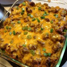 Slightly heat a 3 to 4-quart pot (or skillet) over medium-high heat; add the beef, onion, and seasoning and cook until meat is done, breaking the meat up in somewhat large chunks as it cooks. Drain off any excess grease.