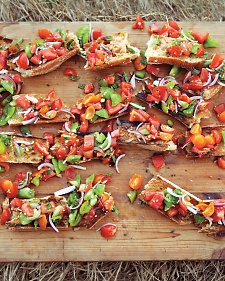 Step 2Toast cut side of baguette halves on grill or under broiler 1 to 2 minutes. While still hot, lightly rub cut surface with garlic. Spoon tomato mixture over bread with a slotted spoon, then add onion. Tear basil into pieces, and scatter on top. Slice each baguette half into 3- or 4-inch-long pieces (about 12 slices per baguette).