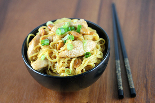 Place cooked noodles onto a serving plate. Spoon the chicken and sauce over the noodles (or you can mix everything together if you want). Garnish with peanuts before serving.
