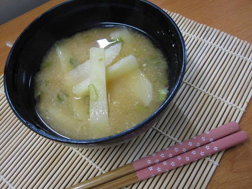 Miso soup is a traditional Japanese soup in which we use dashi for the base, then mix with miso paste. Jyagaimo means potato. You might not think so, but potatoes goes really well with miso soup.