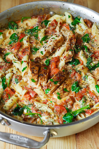 Chicken Penne with Spinach and Bacon in Creamy Tomato Sauce