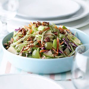 1. In a very large bowl combine shredded broccoli, grapes, and apples. Up to 1 hour before serving, pour salad dressing over broccoli mixture; toss to coat. Cover and chill . Transfer to a serving bowl. Sprinkle with nuts; toss again. Makes 12 to 16 servings.