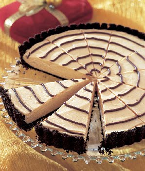 Melt chocolate in top of double boiler set over simmering water. Whisk in reserved 3 tablespoons filling. Immediately transfer chocolate mixture to pastry bag fitted with 1/8-inch plain tip. Pipe chocolate mixture in spiral atop filling. Using small sharp knife, begin at center and draw tip of knife toward edge of tart. Move knife over 2 inches; begin at edge and draw tip of knife toward center. Repeat to form web pattern. Chill until cold. (Can be made 2 days ahead. Keep chilled.) Cut tart into wedges and serve cold.