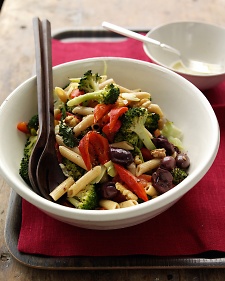 Remove skin from roasted garlic. In a small bowl, mash garlic until it forms a paste; whisk in lemon juice and remaining tablespoon oil. Season with salt and pepper. Pour mixture over pasta; toss in broccoli, red peppers, olives, and walnuts. Add some reserved cooking water, if needed. Serve at room temperature or chilled.