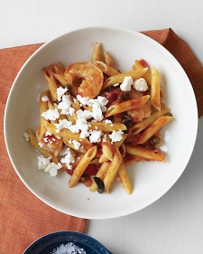 Meanwhile, cook pasta until al dente; drain. Add 2 tablespoons oil to pot and heat over medium-high. Add 3/4 pound shrimp and cook until opaque throughout, 1 to 2 minutes. Return pasta to pot and add tomato sauce; stir to combine. Serve pasta topped with 4 ounces crumbled feta.