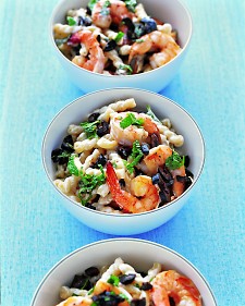 Meanwhile, in a large skillet, heat oil over medium heat. Add half the shrimp; season with salt and pepper. Cook until just opaque throughout, about 3 minutes. Transfer to a large bowl. Repeat with remaining shrimp.