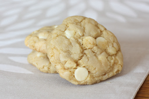 Preheat oven to 350. Cream butter and sugars until fluffy. Add vanilla and eggs, one at a time, beat well. Blend in flour, baking soda and salt. Stir in white chips and nuts. Drop by teaspoon onto ungreased cookie sheets.