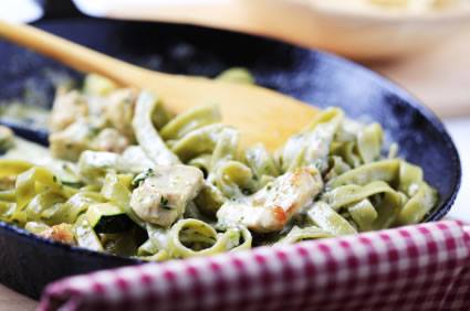 While fettuccine is cooking, heat reserved marinade in 10-inch skillet over medium heat.