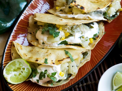 Add potatoes and corn, and continue cooking for a few minutes, until potatoes are heated through. Check seasonings. If you are using crema, stir in at the last minute or so of cooking. Place in warm tortillas and add condiments as you wish.