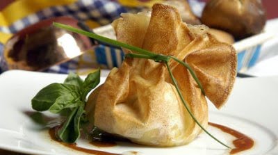 Ve depositando un par de cucharadas del relleno en cada hoja de pasta. Hecho esto, forma unos saquitos y ciérralos con una hoja de cebollino.