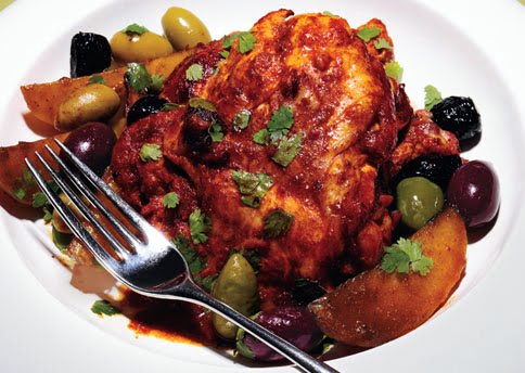 Roasted Chili-Citrus Chicken thighs with mixed Olives and potatoes