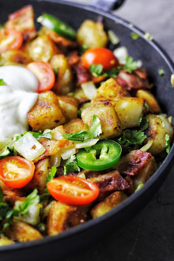 In a large pan, heat 1 1/2 tbsp of olive oil over medium high heat. Add the garlic, onions, and jalapeno and stiry fry until tender and fragrant, about 2 minutes. Add in the potatoes, bacon, and the grape tomatoes into the pan and mix well. Serve with sour cream and top with cilantro and jalapeno peppers.