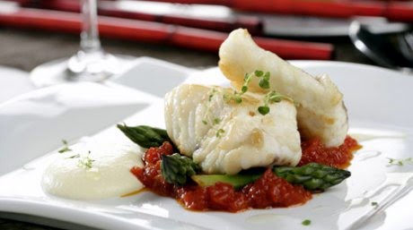 Coloca un par de cucharadas de mermelada de tomate. Sobre ésta disponemos cuatro puntas de espárrago y una ración de rape. Acompañamos con un poco de crema de coliflor y decoramos con unas hierbas aromáticas (orégano, tomillo, romero, etc.).