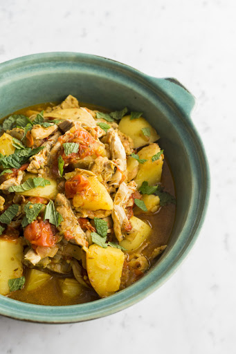 Meanwhile, using two forks, pull the chicken into bite-size pieces, then return to the pot and stir to combine, taking care not to break up the potatoes. Stir in the lemon juice, then taste and season with salt and pepper. Transfer to a serving bowl and sprinkle with mint. Serve with rice and lemon wedges.