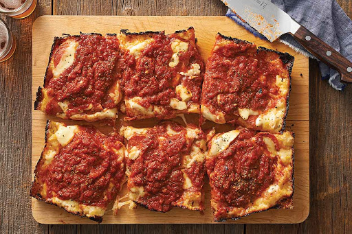Drizzle 1 to 2 tablespoons of olive oil into a Detroit-style pizza pan or a 9” x 13” pan. Gently stretch the dough into the edges and corners of the pan until it starts to shrink back and won’t stretch any farther.