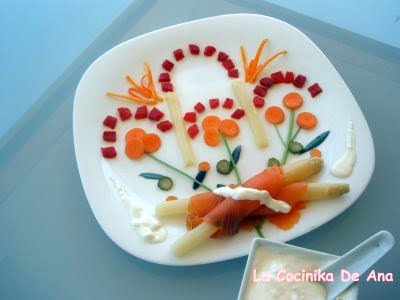 Los espárragos blancos, los he envuelto en laminas de salmón ahumado. He decorado el plato, con pimientos asados, pepinillos, aceitunas negras, tallos de hojas de cilantro, zanahorias...