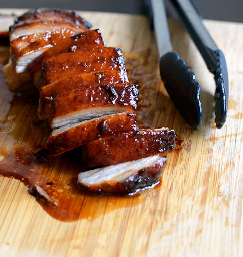 * The pork is done when the outsides begin to crisp and blacken and the center of the pork belly strip feels firm.