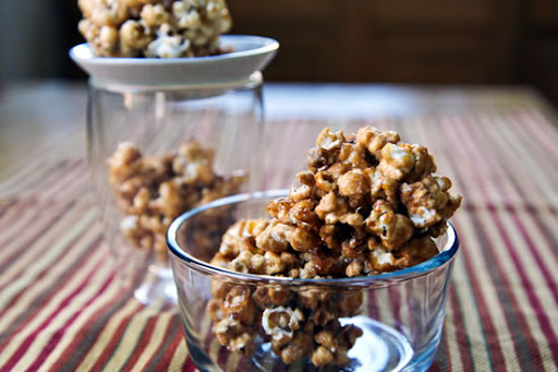 4.Lightly oil a baking sheet or line it with a silpat. Preheat the oven to 250 degrees Fahrenheit. Pour ¾ cup of the maple syrup and butter into a small saucepan. Cook the syrup on medium high, stirring frequently, until it reaches 250 degrees, the firm ball stage (when a little bit of syrup is dropped into cold water, it will form a firm ball that will flatten when you squeeze it) – about 8 to 10 minutes. Watch the pan carefully as the maple syrup may boil over. Drizzle the syrup over the popcorn and toss with a heatproof spatula or wooden spoon.