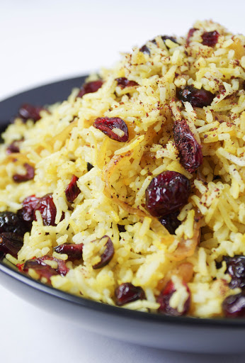 Pour a tablespoon of olive oil into the base of the pot and add the rice. Pour the saffron water evenly over the rice. Top with the onion/cranberry mixture and wrap the lid of the pot with a thin kitchen towel and cover the pot.Turn the heat on high and cook for approximately 3-4 minutes, then turn the heat as low as it will go and continue to cook for an additional 10 minutes.
