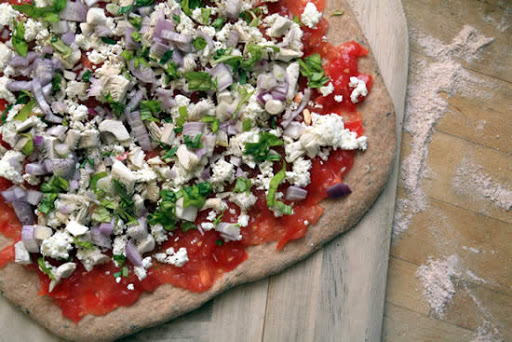 Sprinkle a liberal amount of flour on a clean countertop and on your hands. Tear off a chunk of dough about the size of a softball. If you’re already an advanced pizza maker, and can toss the dough, by all means go for it. Instead, here’s what I do: Form it into a ball and then place on the floured surface. Using a rolling pin (or wine bottle, in a pinch), roll the dough into a 12″ round(ish) shape. It doesn’t have to be a perfect circle, but it is a little easier to get in and out of the oven if it’s somewhat round.