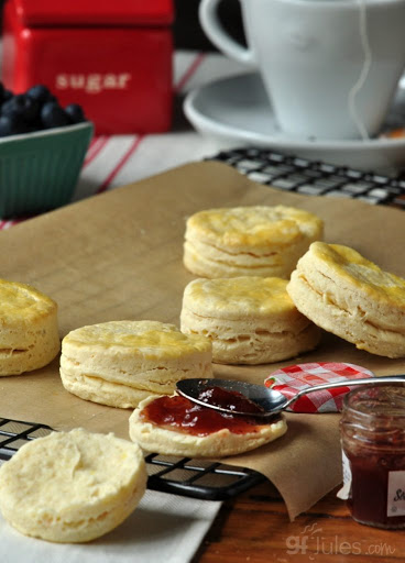 Dip a biscuit cutter into more gfJules Flour and push straight down to cut the biscuits; do not twist with the cutter. Repeat with remaining dough, gathering dough scraps together when necessary, and re-patting flat to cut more biscuits.