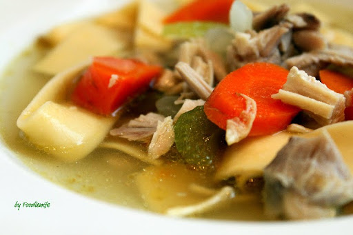 I can't buy canned soup, because nothing compares to homemade chicken soup. Sure, everyone's mom makes chicken soup! I've made countless pots of chicken soup. I've come to the conclusion that when the chicken is seared and browned (as opposed to boiled in water, raw) that the broth has a richer flavor. I use chicken thighs, bone-in and skin on, which really pumps up the flavor and the chicken doesn't dry out as with white chicken breast. I also like to make a bouquet garni of fresh hersI ate two bowls of this soup, to help me get through a bout of that pre-cold feeling. Ah, chicken soup for the soul...