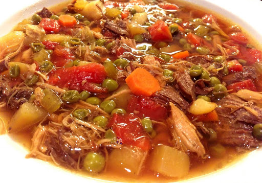 Bring beef broth to a boil in a medium saucepan. Add the beef shank, cover and reduce to medium-low simmer, and cook for 30 minutes. In a large stockpot, bring olive oil to medium heat and add potatoes and onion. Cook, stirring occasionally, for 10 minutes or until onion is translucent. Add garlic and cook for an additional 4 minutes. Add the chicken broth, shredded chicken, carrots, celery, tomatoes, peas, green beans, corn, salt and pepper, bay leaves and celery seed. Cover and maintain a medium-low simmer. When the beef shanks are finished (and falling off the bone) transfer the meat to a cutting board. Remove any fat and chop beef. Transfer beef and remaining beef stock into the stockpot with everything else. Cook, covered, for 2 ½-3 hours. Check on the progress every 35-40 minutes and add water, as needed, to cover the contents completely. Add vinegar with 20 minutes remaining.