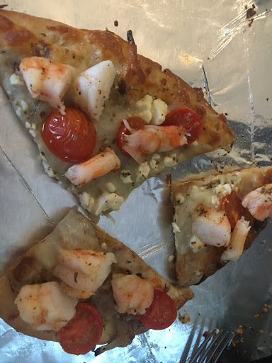 Saute onion until slightly caramelized. Toss raw shrimp with olive oil and Italian seasoning and put on sheet pan. Assemble pizza on another sheet pan. Brush with a little olive oil, sprinkle garlic salt, add onion, cheeses and tomatoes and sprinkle a little Italian seasoning. Put both shrimp and pizza in oven set at 400. Take shrimp out after 6 minutes and cook pizza until brown, about 10-15 minutes. In the mean time, cut up the shrimp in bite size pieces and add to pizza when done.