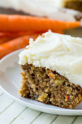 Pineapple Carrot Cake is super moist and has lots of spice flavor. Made in a 9X13-inch pan, it's easy to cut into squares and share. The cake is covered in a rich and creamy cream cheese icing.