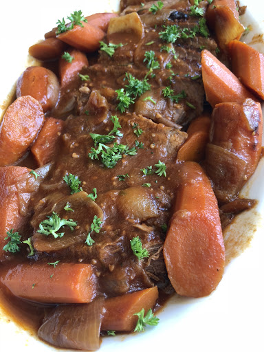 I recommend using a heavy duty Dutch oven to slowly braise a cut of brisket for 5 hours. The prep work is less than 1/2 hour and five hours later, you have tender beef with a succulent red wine and garden herb sauce. It's delicious served over mashed potatoes or polenta.