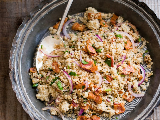 In a large bowl, toss together the cooked quinoa, bacon pieces, red onion and parsley. Toss with the dressing and serve at room temperature or chilled