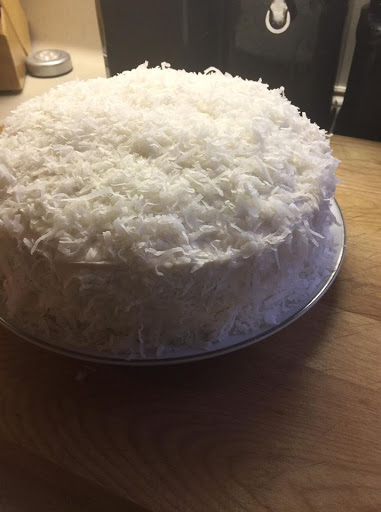 To assemble, place 1 layer on a flat serving plate, top side down, and spread with frosting. Place the second layer on top, top side up, and frost the top and sides. To decorate the cake, sprinkle the top with coconut and lightly press more coconut onto the sides. Serve at room temperature.