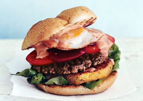 Spread chile mayonnaise on rolls, then assemble burgers with pineapple, beets, eggs, lettuce, and tomato.