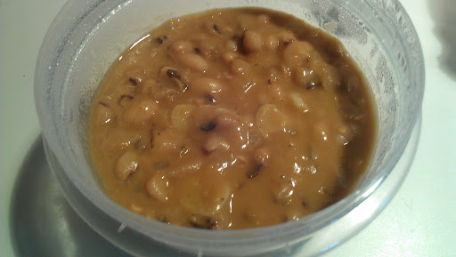 (1) Make 3-4 servings of a simple stew by sautéing a diced onion, then adding a couple minced garlic cloves and one container of black eyed peas. (The black eyed peas already have all the smoky spice that you need.) Heat until it simmers. Meanwhile, chiffonade a bunch of kale or other dark greens. Add those to the pot and simmer a few minutes to your liking. Serve it over rice and call it something fancy like "Kale Chiffonade" or lie and call it "Veggie Hoppin' John."