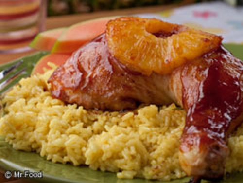 Remove chicken from oven. Arrange pineapple slices over chicken.