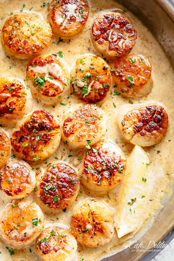 Remove pan (skillet) from the heat; stir in lemon juice and add the scallops back into the pan to warm through slightly and garnish with parsley.