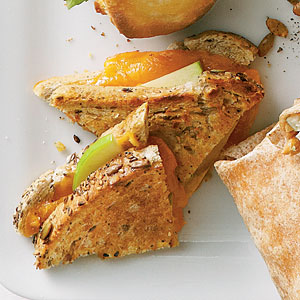 Spread about 1 tsp. mustard on 1 side of each bread slice. Place 1 cheese slice on each of 4 bread slices; top with apples. Top with remaining cheese and bread, mustard sides down. Coat both sides of sandwiches with cooking spray. Cook sandwiches in a preheated panini press 8 to 10 minutes or until golden brown.