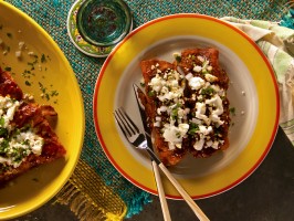 For the colorado sauce: Heat a medium skillet over medium-high heat. Toast the chiles skin-side up until fragrant and beginning to darken, 30 seconds to 1 minute. Transfer the chiles to a bowl and pour over the boiling water, or enough to cover the chilies; soak until softened, about 15 minutes.