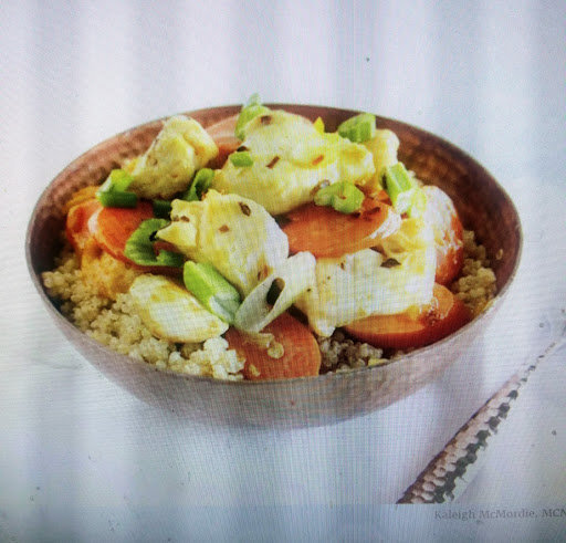 Spoon into bowls with rice or quinoa and sprinkle with green onions and red pepper flakes.