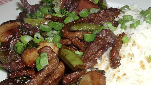 Heat oil in a wok or skillet over medium high heat. Stir-fry ginger and garlic for 30 seconds. Add the steak and stir-fry for 2 minutes or until evenly browned. Add the snow peas and stir-fry for an additional 3 minutes. Add the soy sauce mixture, bring to a boil, stirring constantly. Lower heat and simmer until the sauce is thick and smooth. Serve immediately.