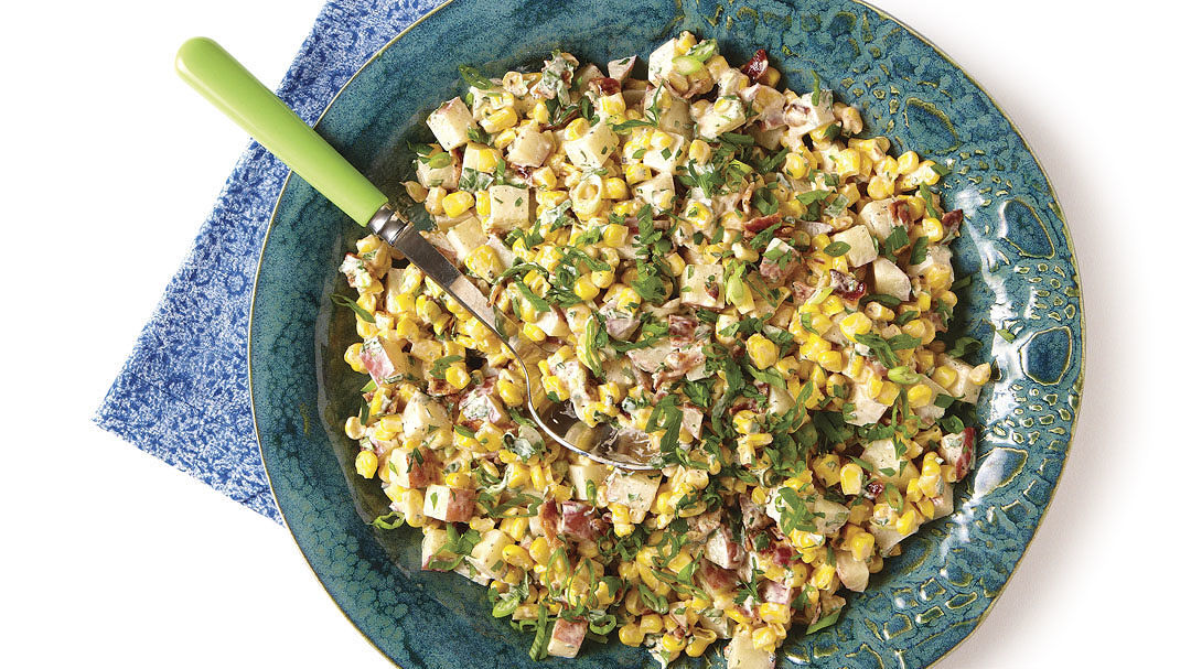 Drain all but 1 Tbs. of fat from the pan. Add the corn and cook over medium heat, stirring occasionally, until the kernels are bright yellow and crisp, about 5 minutes. Transfer to a large bowl to cool.