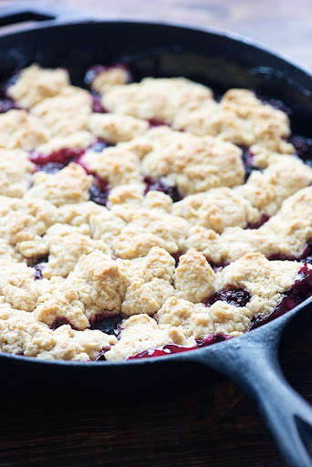 Drop pieces of dough over the berry mixture and place the cast iron pan on a foil lined cookie sheet and place in the oven. Bake for 20-25 minutes, until the dough is golden brown and the berries are thick and bubbly.