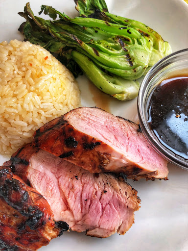 This recipe is slightly adapted from Simply Recipes. The only thing I did, differently, was to simmer the reserved marinade for about 5 minutes and serving it separate in dipping bowls. Each bite of grilled pork was scrumptious when dipped in the marinade. I served this with grilled Bok Choy and Coconut Rice.
